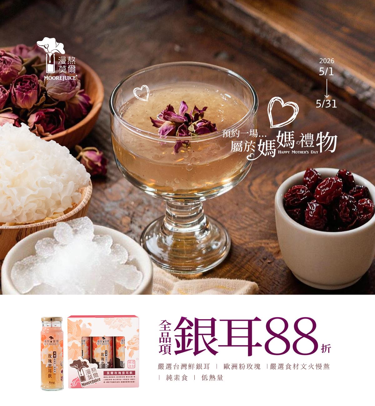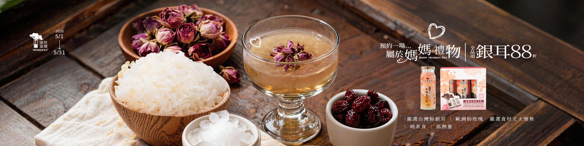 ✔嚴選台灣鮮銀耳 ✔使用歐洲粉玫瑰 ✔ 嚴選食材、文火慢熬 ✔純素食、低熱...