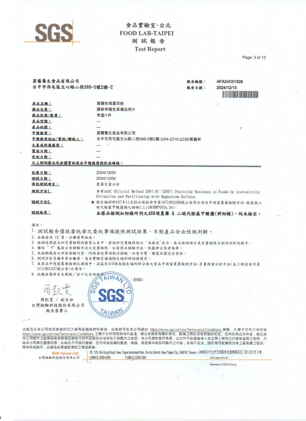 玫瑰雲耳飲 檢驗報告